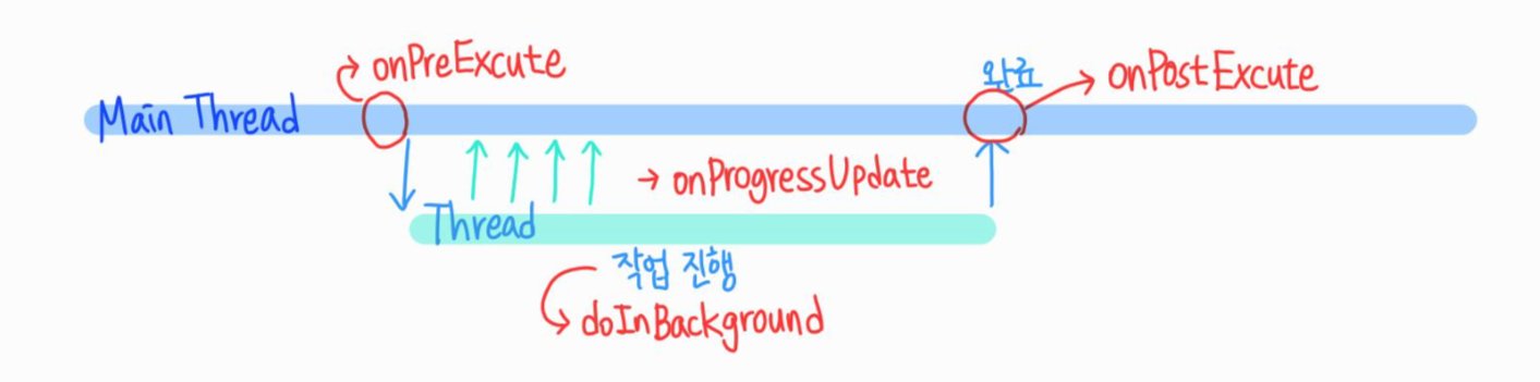 - onPostExcute : ์์ ์ ๋ค ๋ง์น ํ MainThread๋ก ๋ณต๊ท
