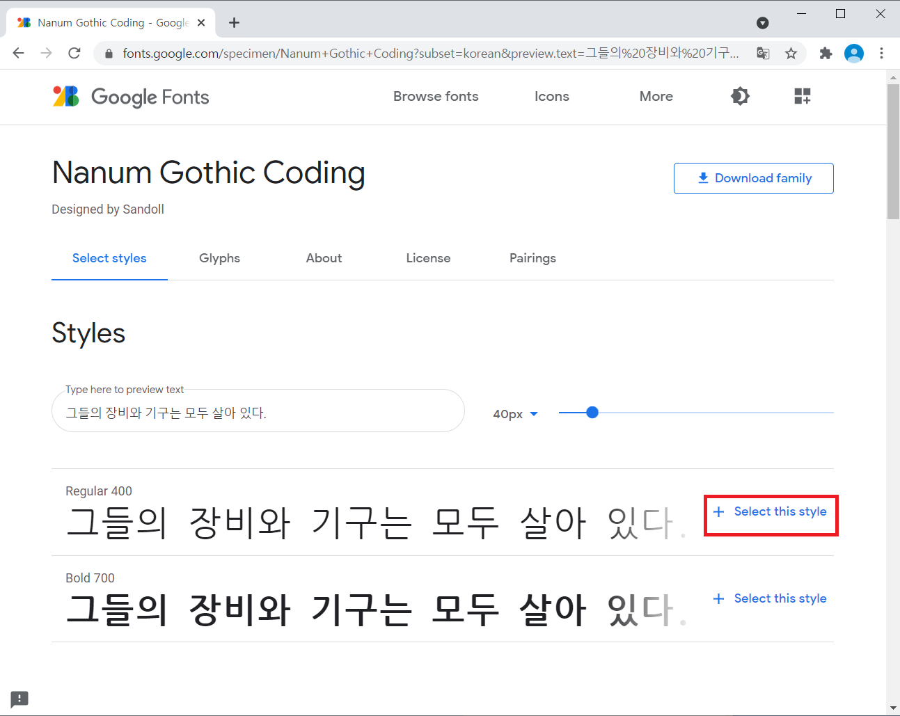 2. ๋ง์์ ๋๋ ํฐํธ๋ฅผ ์ ํํ๊ณ "+ Select this style"์ ํด๋ฆญํ๋ค.