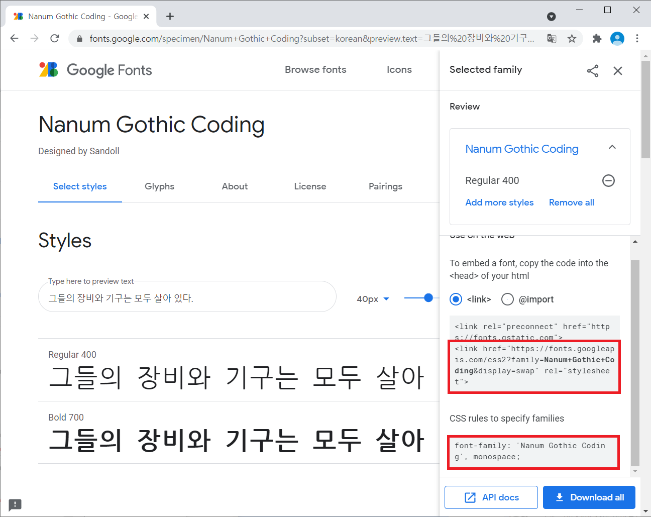 <link href="https://fonts.googleapis.com/css2?family=Nanum+Gothic+Coding&display=swap" rel="stylesheet">